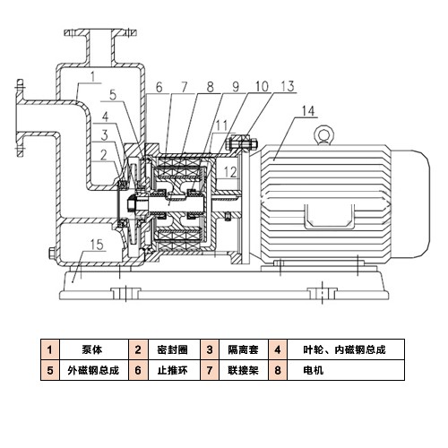 4.自吸磁力泵过载时,内、外磁转子相对滑脱,对电机、泵有保护作用。