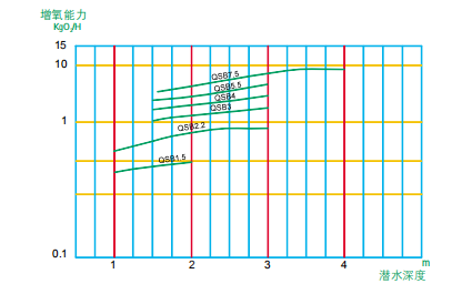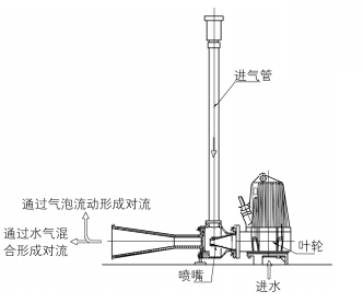 潜水泵产生的水流经过喷嘴产生射流,在喷嘴周围形成负压吸入空气 ,经混合室和水流混合,在扩散管里产生水气混合流,快速喷射而出,夹带许多气泡的水流在较大面积水域里涡旋搅拌,完成曝气,其轴功率不随潜水深度的变化而变化,可以在水位变化较大的池中应用。