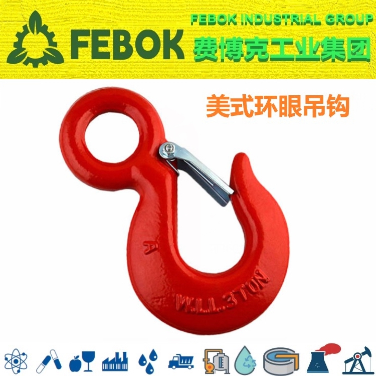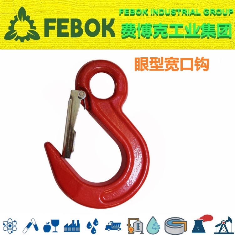 FEBOK INDUSTRIAL GROUP 费博克工业集团眼形宽口钩是一款具备普通眼型吊钩和大开口吊钩共同优点的吊钩,开口大,带保险舌片装置。在部分起重吊装过程中要求吊钩具备带有保